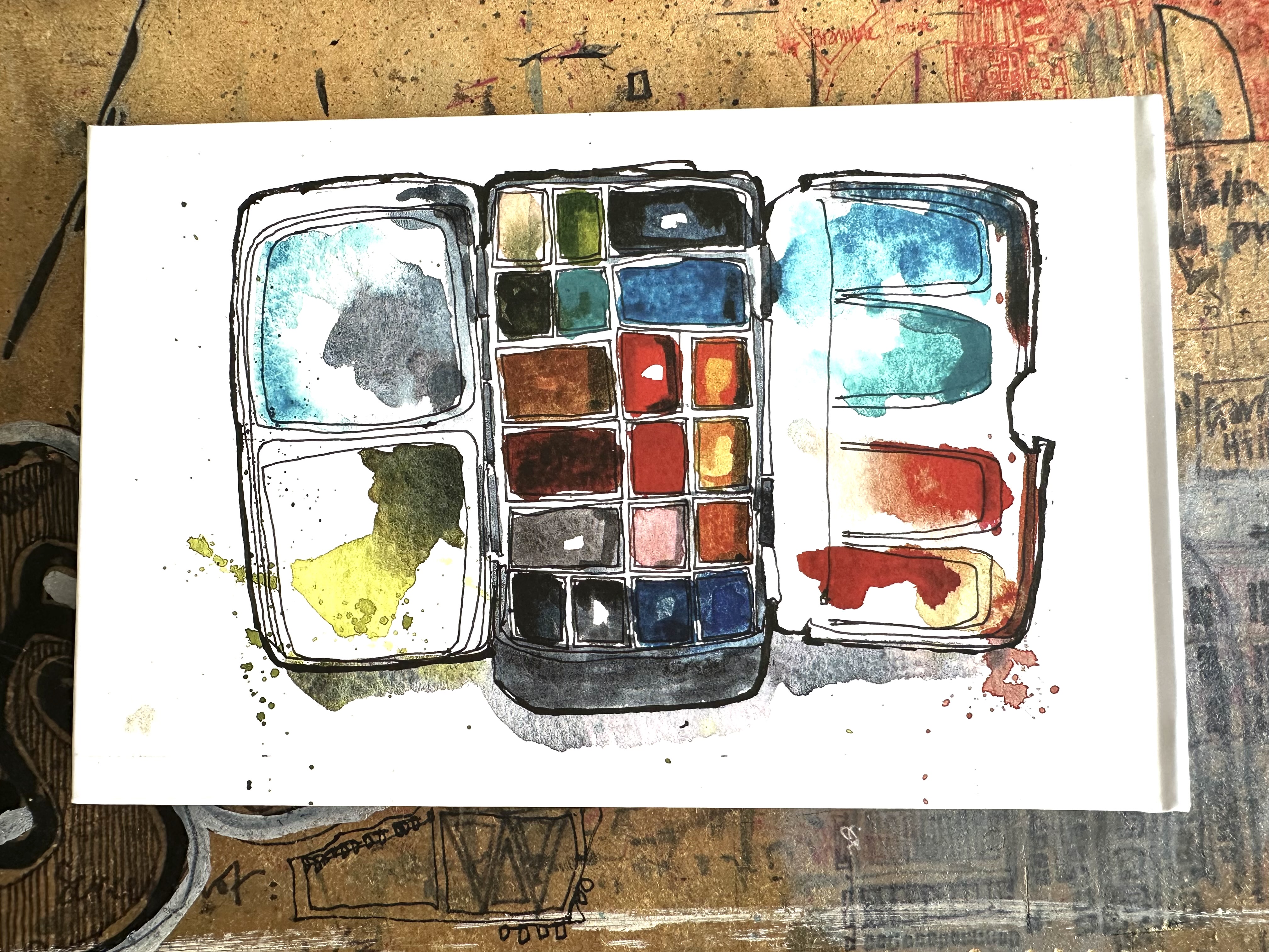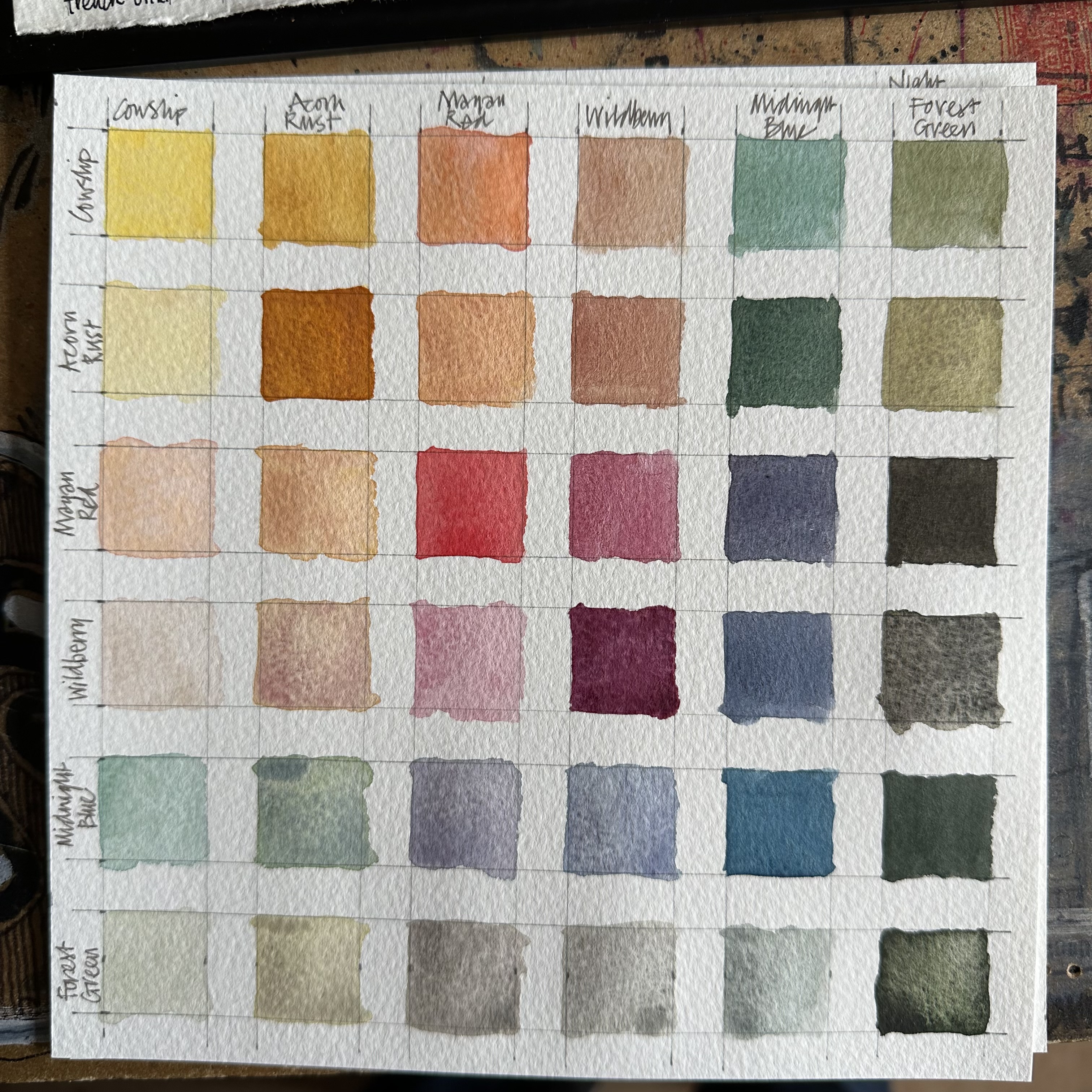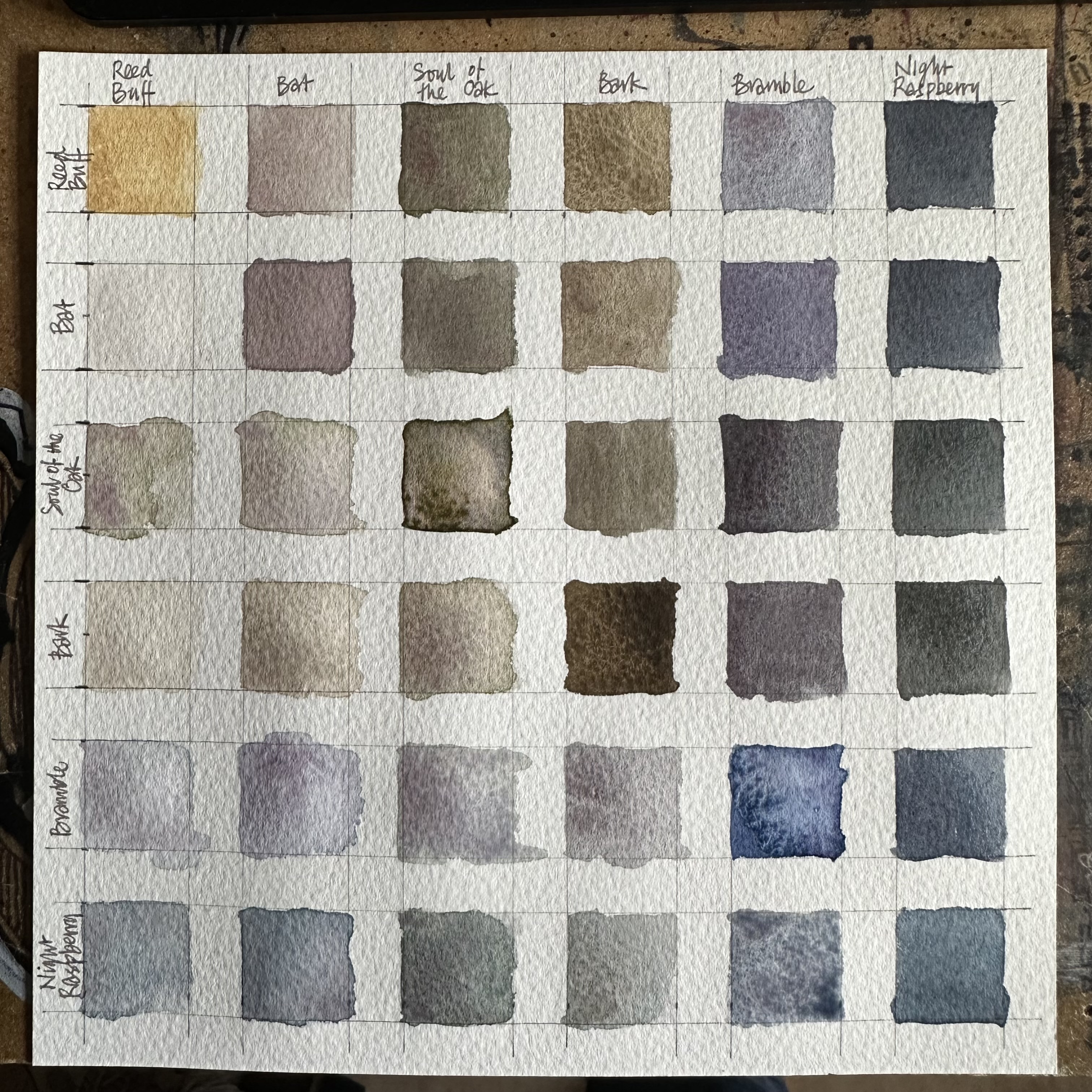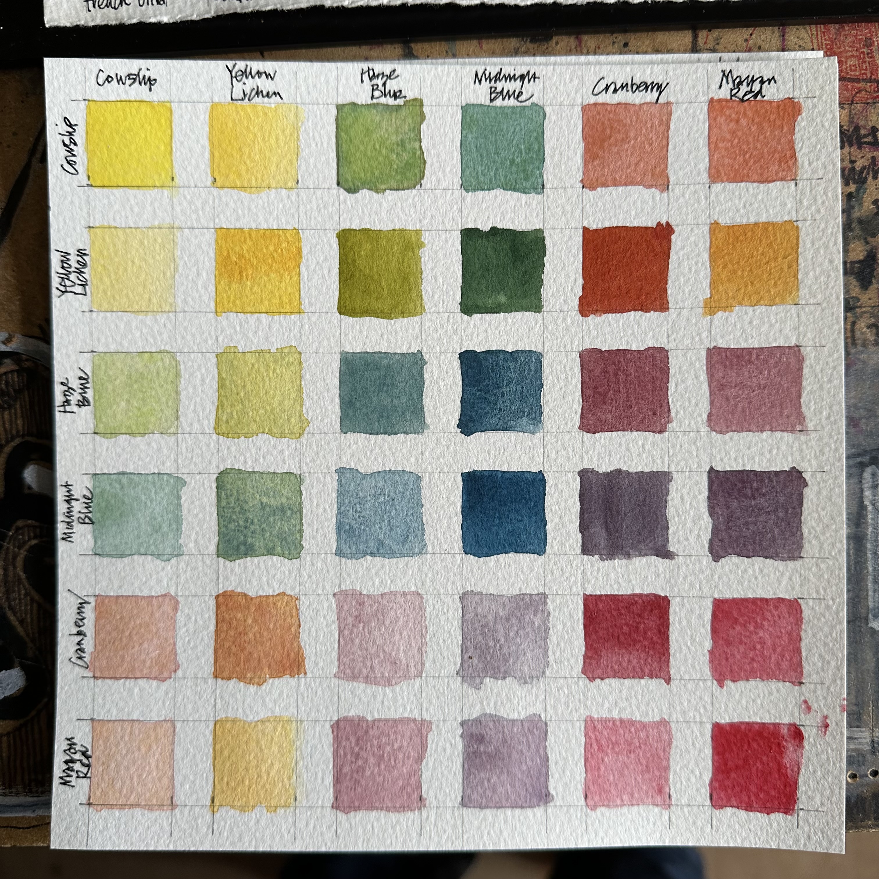 I’m working with the wonderful people at Deep Deep Light to produce a curated palette of watercolours. Working together I gave them a brief of the theoretical colours I like to use in my regular palette. They have taken my brief and selected colours from their range. They gave me some options too. I’m currently making my final selections. They very kindly provided a series of dot cards of my split primaries, secondaries and ancillary colours to give to other artists at Staithes Festival.