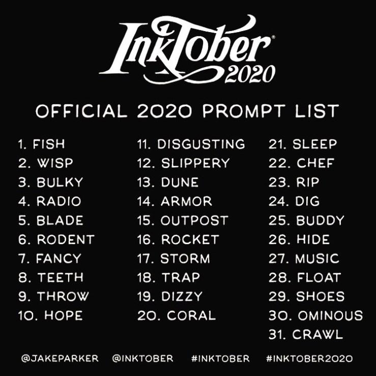 This lead me to come up with the idea of individual postcards for each prompt in Inktober 2020 and to send them out to various friends, relatives, regular clients and other artists I know and simply send them as postcards with a stamp, no protection and not in an envelope. Just to see how many made it to their intended recipients. This is the list of prompts from Jake Parker for 2020: