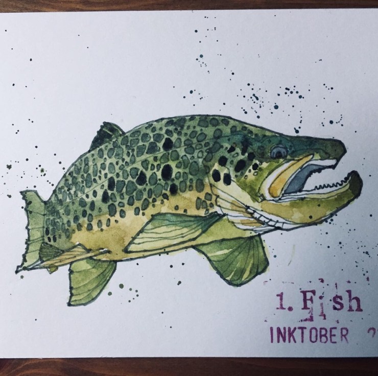 I started with an easy win of a Brown Trout to send to my good friend John, a keen angler. I did it on a regular postcard. It was great to draw on and to use my inking stamps but it didn’t take the watercolour that well. I didn’t discover that until after I had stamped all 31 regular cards with their prompts!!!