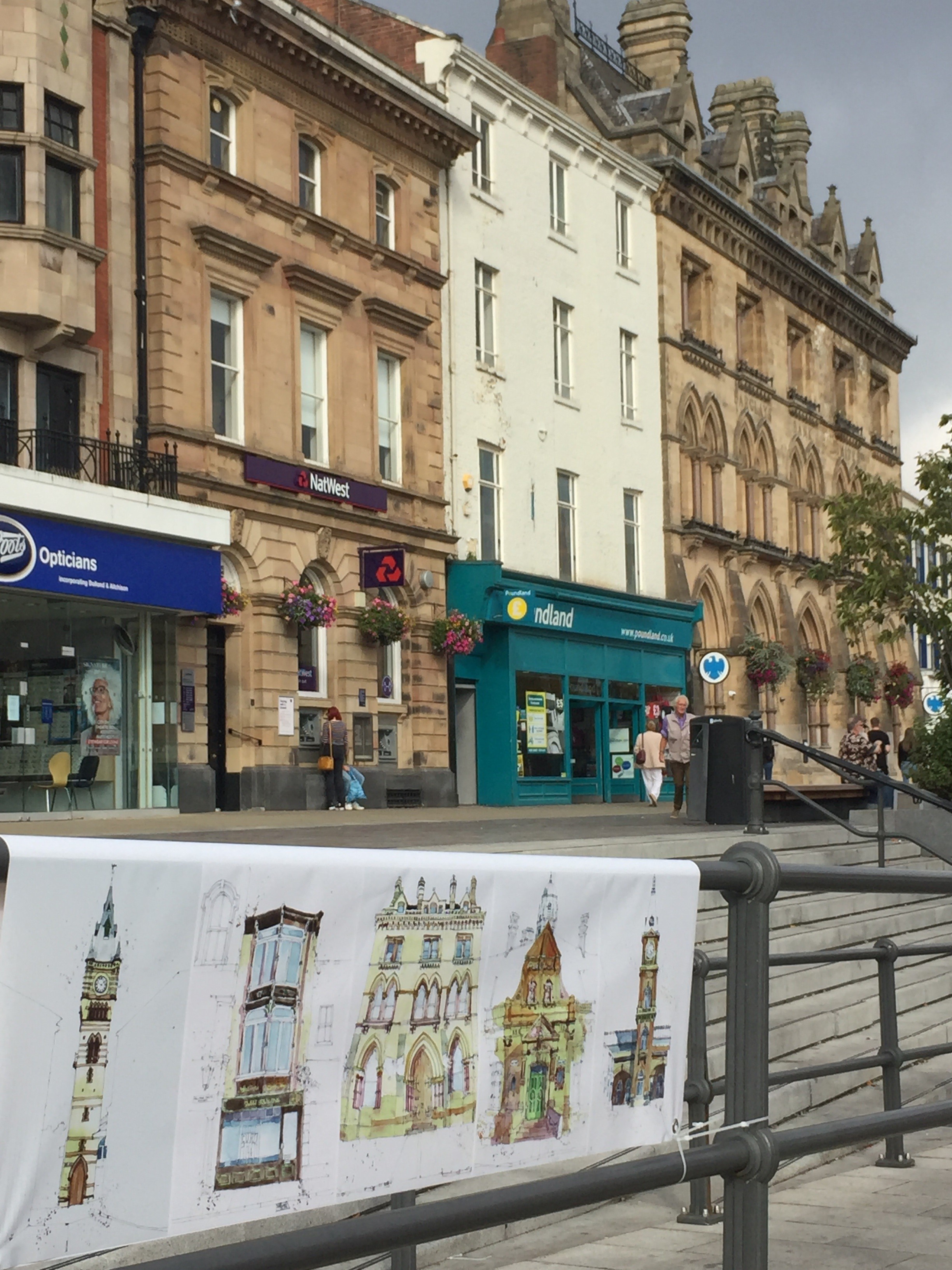 Back in late July/ early August my neighbour, Phil and I hatched an idea for an art collaboration for the upcoming Darlington Arts Festival. To avoid confusion (my own) that’s the Darlington in County Durham, UK, not the one near Perth, Australia! The idea was to create a modern myriorama of Darlington landmarks and combine them with poetry