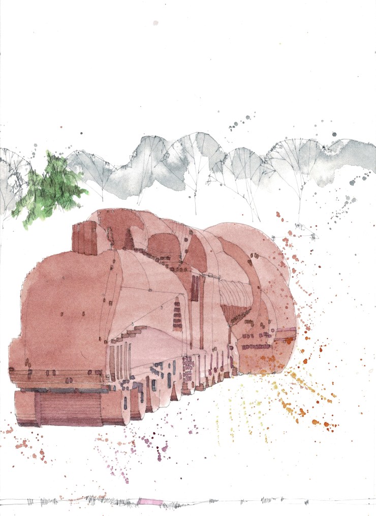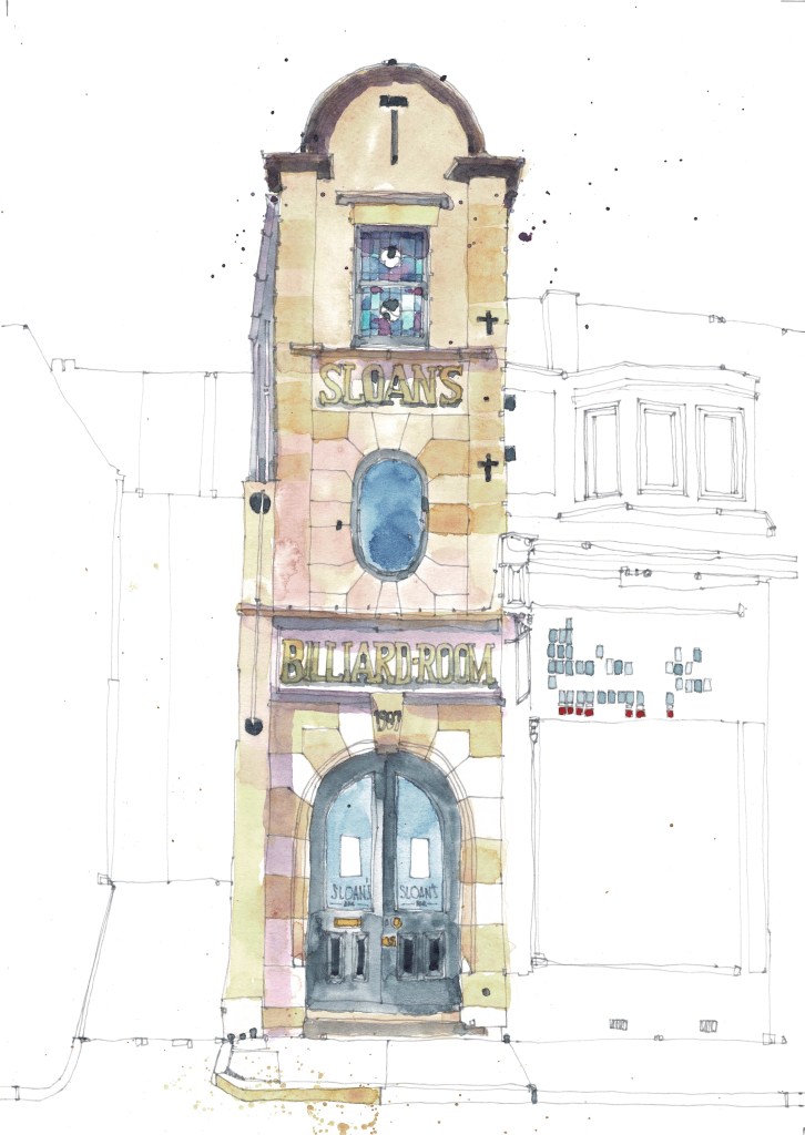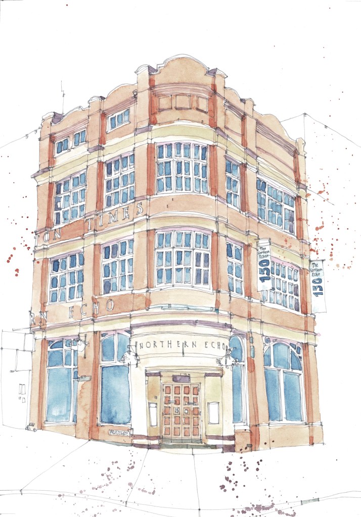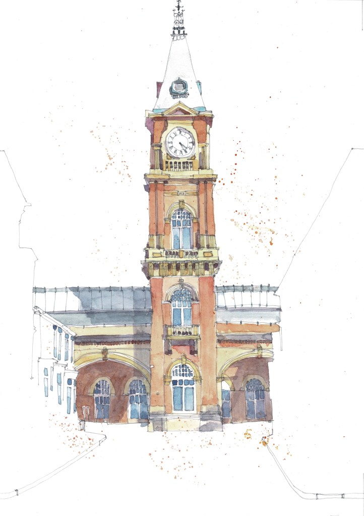 This contemporary version of a Darlington myriorama has been created by me. The drawing and application of colour is typical of my architectural illustrative style. However, it was interesting to note that the pieces became more economical as I progressed. I don’t think that was due to time constraints but more to do with a rhythm and process which developed in the very short time frame I had to complete the work.